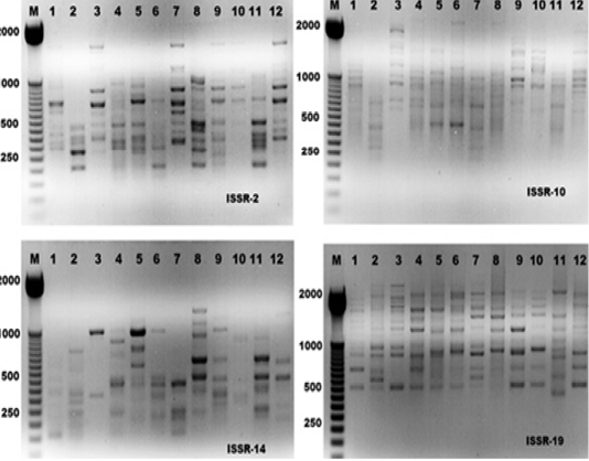ISSR-PCR profiles of the twelve Hyalomma dromedarii samples that generated with four ISSR primers; ISSR-2, ISSR-10, ISSR-14 and ISSR-19, respectively. First lane on each panel is 50 bp molecular weight markers.