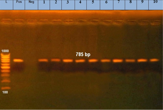 Amplified products of 30 KD a major merozoite surface antigen gene of rDNA for T. annulata. Lane L, molecular size marker (100 base-pair ladder); lanes1: 10 positive samples at 785bp; Lane Neg: negative control, Lane Pos: positive control.