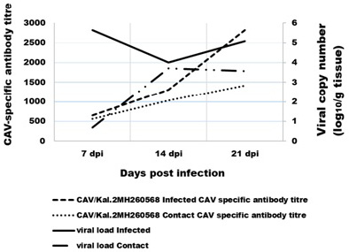 Comparison between the CAV-specific antibody titre in the serum and the virus load in tissue. The virus-specific antibodies were detected using ELISA.