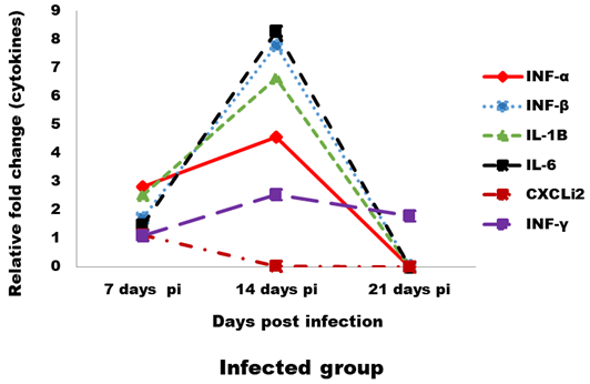 Effect of CAV infection on cytokine expression in the examined tissues of sacrificed birds on various post-infection days in the infected group.