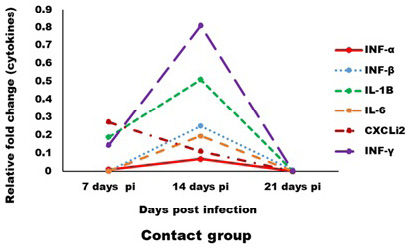 Effect of CAV infection on cytokine expression in the examined tissues of sacrificed birds on various post-infection days in the contact group.