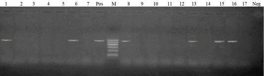 Lanes 1, 6, 8, 13, 15, 16: positive amplification of tetA gene at 576 bp