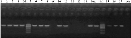Lane 1-7, 9, 10, 14, 15- 17: positive amplification of blaTEM gene at 516pb fragment.