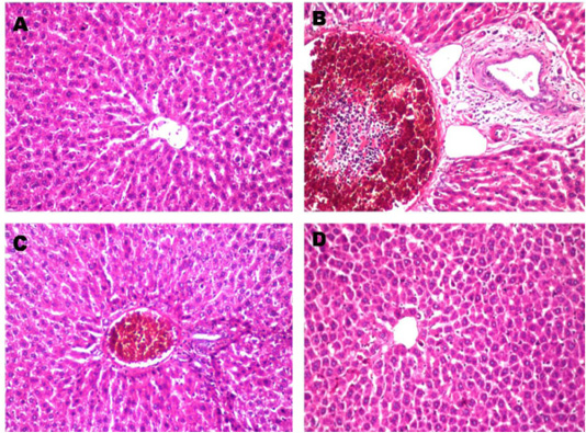 Histopathological changes in liver after treated with paracetamol and/or Ocimum basilicum. A: Normal liver section from control rat shows no histopathological alteration and the normal histological structure of the central vein and surrounding hepatocytes in the parenchyma (X10). B: Paracetamol treated rats showed sever congestion and dilatation in the portal vein associated with inflammatory cells infiltration and oedema in the periductal tissue surrounding the cystic dilated bile ducts (X20). C: Paracetamol + Ocimum basilicum (200 mg/kg bwt) treated rats, showed congestion in the portal vein associated with few inflammatory cells infiltration surrounding the bile ducts (X10) and D: Paracetamol + Ocimum basilicum (400 mg/kg bwt) treated rats, there was no histopathological alteration were recorded (H and E).