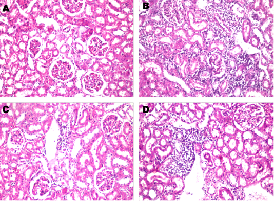 Histopathological changes in renal cortical tubules after treated with paracetamol and/or Ocimum basilicum. A: Kidney section from control rat shows the normal histological structure of the glomeruli and tubules at the cortex (X10). B: Paracetamol treated rat shows, Massive inflammatory cells infiltration was detected in between the degenerated renal tubules at the cortex (X10). C Paracetamol + Ocimum basilicum (200 mg/kg bwt) treated rats, showed focal inflammatory cells infiltration was detected in the perivascular area surrounding the cortical blood vessels (X10) and D: Paracetamol + Ocimum basilicum (400 mg/kg bwt) treated rats, focal inflammatory cells infiltration was detected in between the tubules at the cortex (H and E).