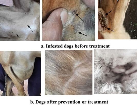 showed tick infestation and skin affections in dogs. a: Before essential oils mixture treatment (Arows). b: After prevention or treatment.