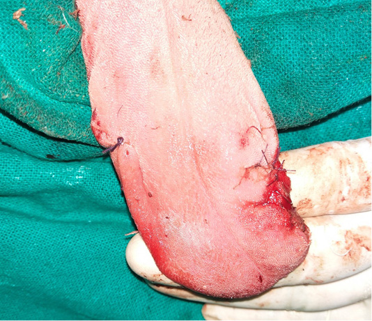 Reconstructed tongue margins following the surgical excision of nodular cauliflower shaped nodules.