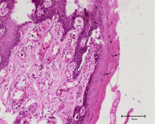 Histomicrograph showing diffuse epidermal hyperplasia with parakeratosis (arrows), broad and elongated rete pegs (arrowhead) and neovascularization of superficial dermis (star). H and E, 10x.