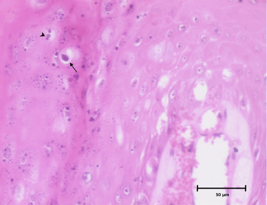 Histomicrograph showing koilocyte with a clear perinuclear cytoplasmic vacuolization (arrow) and clumps of keratohyalin granules (arrow head) in stratum granulosum of epidermis. H and E, 10x.