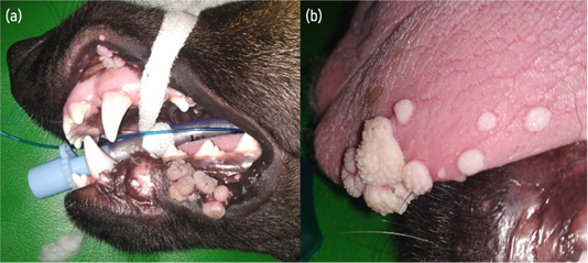 (a) Gross appearance of nodular masses having different sizes present in the lips and gingiva. (b) Multiple nodular mass present at the tongue margin.