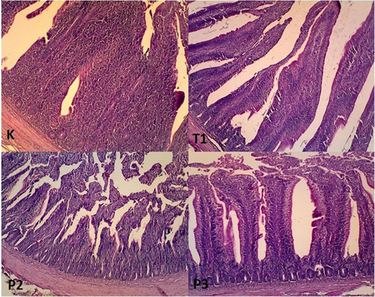 Histophatology of duodenum organ in magnification 400x. K: Layers arrangement of epithelium columnar simplex, no erosion found (Magnification 400x). T1: Layers arrangement of simple columnar epithelium, found a slight erosion (Magnification 400x). P2: Layers arrangement of epithelium simple columnar, found a slight erosion (Magnification 400x). P3: Layers arrangement of epithelium simple columnar, found an erosion (Magnification 400x).