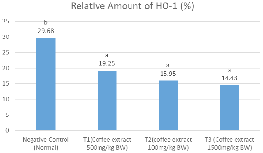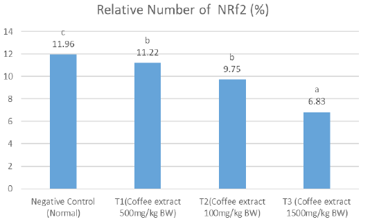 A significant differences notation (a, b c and d) showed between treatments for the relative level of Nrf2 (P <0.05). T1, T2 and T3 showed lower Nrf2 levels than negative controls. This shows that robusta green coffee extract can reduce levels of Nrf2.