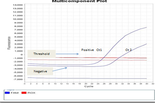 showed that the real-time PCR baseline subtractive Ct fit view of positive BoHV-1 1 DNA plotted against cycle number from left to right, Ct1 represents reactions containing copy number from nasal swabs of infected rabbit groups without treatment control positive group. No Ct curve denoted good inhibitory NPs effect on BoHV-1.