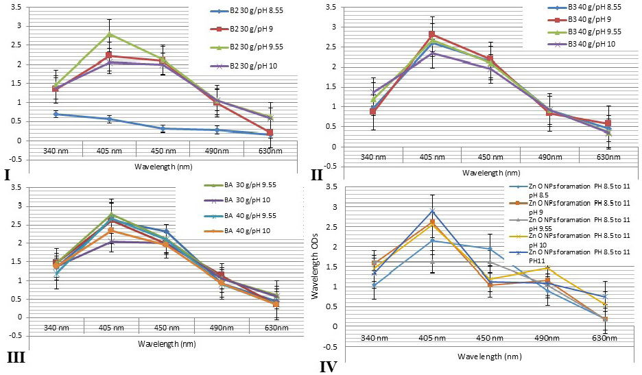 Showed that the spectrophotometer absorption wavelength value of AgNPs colloids for different honey concentrations gave a peak at wavelength level 405 and 450 nm. I: 30g at differences pH values at 8.55, 9, 9.55 and 10. II: 40 g honey concentrations at differences pH values. III: showed that the comparing results for different honeys concentrations at different pH values revealed nearly similar peak at wavelengths 405 and 450 nm for all honey groups. IV: showed that the comparing results for different green ZnONPs suspension at different pH values revealed nearly similar peak at wavelengths 405 and 450 nm for all olive leaves plant extracts.