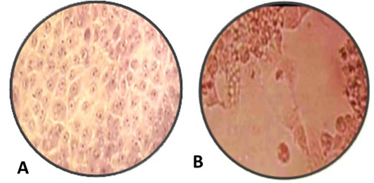 A: Normal MDBK cell culture non- infected or non-treated with nanoparticles, B: inoculated MDBK cell culture with suspected BoHV-1 virus 10 7 TCID 50% which showing cell rounding, cells aggregations and formation clusters of rounded cells cytopathic effect (CPE) stained with Hematoxylin and Eosin, (Magnification power 100X).