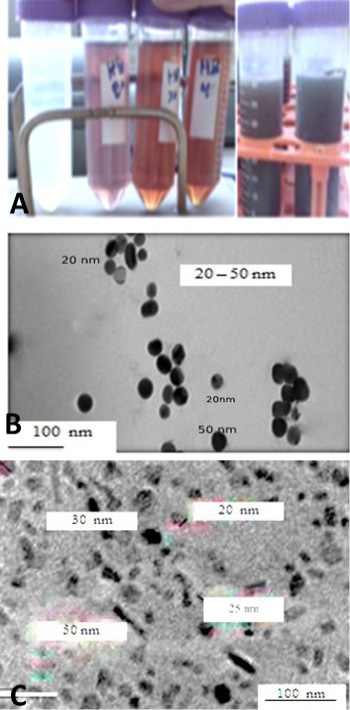 A: showed that the formation of AgNPs in colloid with different honey concentration and different PH 8.5 to 10.5. B: micrograph TEM of silver nanoparticles was demonstrated (spherical particles with particle size diameter < 50 nm. C: TEM micrograph of zinc oxide nanoparticles which showing prismatic shaped while others cubic shaped. The green silver and ZnONPs showed particle size ranged between 20 and 50 nm with the average particle size of 10–50 nm, respectively.