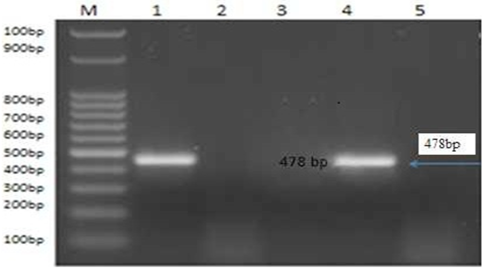 PCR product of the 478bp for amplified of BoHV-1 using primer for GI glycoprotein gene fragment, Lane M: 100bp ladder. Lane 1: control positive BoHV-1. Lanes 2: control negative samples Lanes 3 and 5: treated by AgNPs or ZnONPs inhibitory effect on BoHV-1 in experimentally infected rabbit from nasal swabs Lane 1: control positive BoHV-1. Lane 4: control positive group.