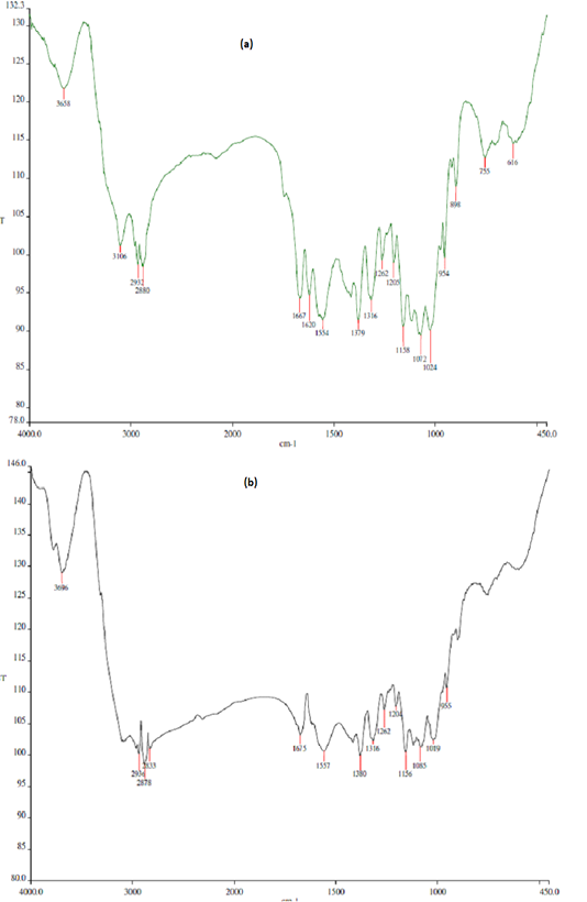 Fourier transform infrared (FTIR) profiles of chitin (a) and chitosan (b) derived from black soldier fly (BSF).
