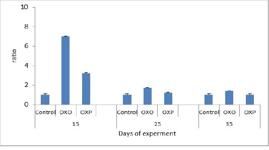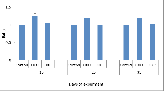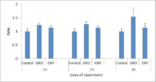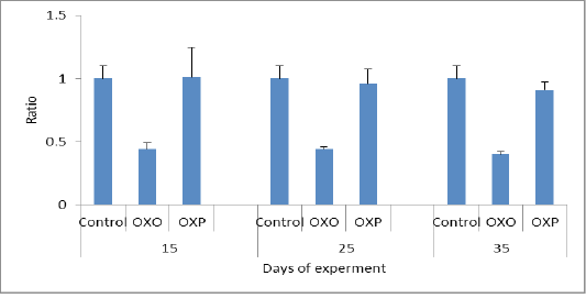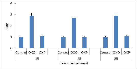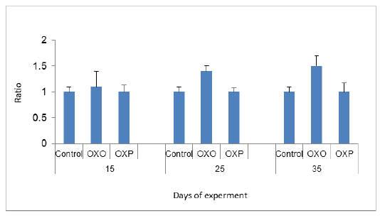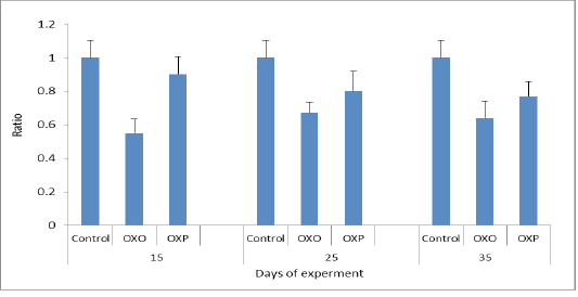 Uric acid ratio in different groups across days of experiment. P value and the significance was measured (* p < 0.05 vs. OXO).