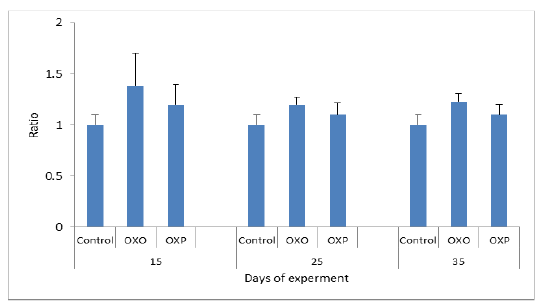 MDA ratio in different groups across the experiment. MDA P value and the significance was measured (* p < 0.05 vs. OXO).