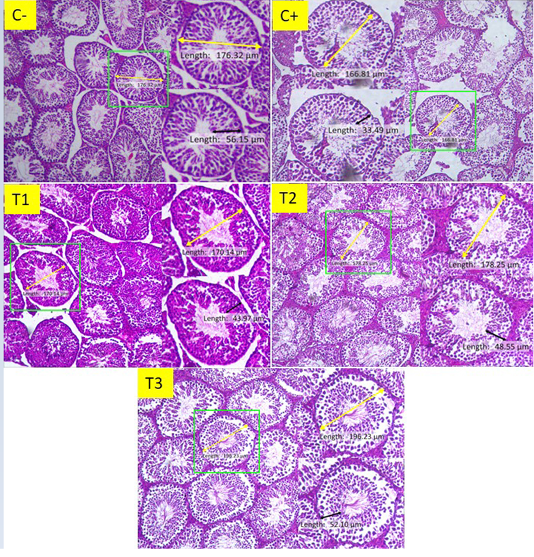 Histological features of seminiferous tubules of mice (Mus musculus) in groups C-, C +, T1, T2, and T3 (100 X, H&E stain). The yellow line shows the measurement of the diameter of the seminiferous tubule, while the black line shows the measurement of the thickness of the seminiferous tubular epithelium.