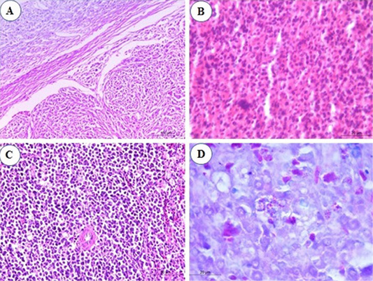 Photomicrograph from spleen of chicken infected with avian leucosis virus type J during the experimental period; (A) At the 3rd month post infection (mpi), marked hyperplasia of ellipsoidal reticular cells at subcapsular sinuses (H and E, bar 100); (B) At the 4th mpi, collection of lymphocytes showing pleomorphism and mitotic activity (H and E, bar 20); (C) At the 5th mpi, pleomorphic lymphoid cells in splenic tissue with mitotic figures (H and E, bar 50) and (D) At the 4th mpi, few myeloid cells with eosinophilic granules (Giemsa stain, bar 20).
