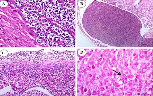 Photomicrograph from heart of chicken infected with avian leucosis virus type J during the experimental period; (A) At the 1st and 2nd month post infection (mpi), focal lymphocytic aggregation between muscle bundles of myocardium. The lymphocytes showing pleomorphism and mitosis (H and E bar 50); (B) At the 3rd mpi, severely dilated engorged coronary packed with numerous erythroblasts. Hemosiderin deposits could be observed (H and E bar 100); (C) At the 4th mpi, massive infiltration of myocardium with leucocytes which compress the myocardial fibers causing its atrophy, degeneration and dissociation. The lymphocytes show pleomorphism (H and E bar 100) and (D) At the 5th mpi, massive infiltration of myocardium by myeloid cells (arrow) with eosinophilic granules (Giemsa stain bar 20).