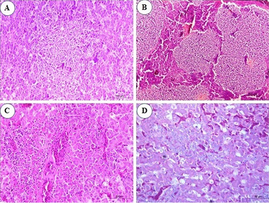Photomicrograph from liver of chicken infected with avian leucosis virus type J during the experimental period; (A) At the 3rd month post infection (mpi), marked activation of Kupffer cells with aggregation of some reticular cell between hepatocytes (H and E, bar 100); (B) At the 4th mpi, expanding of neoplastic nodules, displacing and compressing surrounding parenchyma. The tumors are composed of pleomorphic lymphoid cells (H and E, bar 200); (C) At the 5th mpi, the hepatic parenchyma was compressed and replaced by immature myeloid cells (H and E, bar 50); (D) At the 4th mpi, focal aggregation of few myeloid cells with characteristic eosinophilic granules were noticed (Giemsa stain, bar 50).