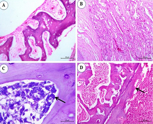 Photomicrograph from sternal bone of chicken infected with avian leucosis virus type J during the experimental period; (A) At the 1st and 2nd month post infection (mpi), normal sternal bone with normal periostium (H and E bar 50); (B) At the 3rd mpi, acinar structure with hyperplasia of cell wall with newly formed acini (H and E bar 100); (C) At the 4th mpi, increasing numbers of granulated myeloid cells (arrow) (Giemsa stain bar 20) and (D) At the 5th mpi, osteopetrosis with dentation in the periostium (arrow) (H and E bar 100).