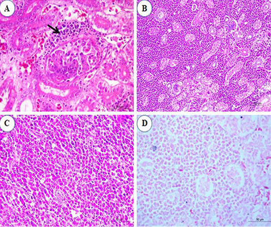 Photomicrograph from kidney of chicken infected with avian leucosis virus type J during the experimental period; (A) At the 3rd month post infection (mpi), periglomerular focal aggregation of pleomorphic lymphocytes (arrow) which showing mitotic activity (H and E, bar 50); (B) At the 4th mpi, heavy infiltration with myeloid cells that replace and compress the renal parenchyma (H and E, bar 100); (C) At the 5th mpi, diffuse infiltration of renal parenchyma by granulated myeloid cells. The renal tubules appear atrophied and completely loss of tubules (H and E, bar 50) and (D) At 5th mpi, diffuse infiltration of renal parenchyma by granulated myeloid cells (Geimsa stain, bar 50).