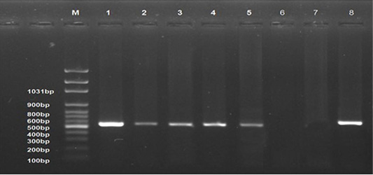 Ethidium bromide stained 1% agarose gel of PCR products showed avian leucosis virus type J (+ve) samples at different experimental periods, (lanes 1-5) of 545 bp PCR products, (-ve) normal control sample (lane 6), and (-ve) control (Lane 7) and (+ve) control (Lane 8). M represents a 100-bp ladder as a size standard.