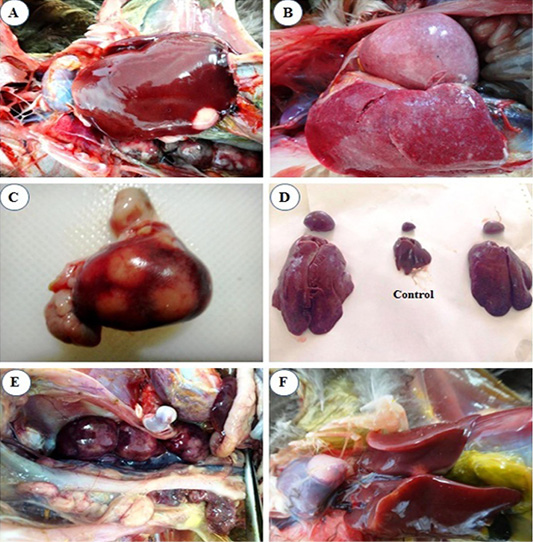 Macroscopic lesions from infected chicks with avian leucosis virus-J; (A) Liver at the 3rd month post infection (mpi), showing small white nodular growth on the border; (B) Liver and spleen at the 4th mpi, showing diffuse enlargement; (C) Spleen at the 5th mpi, showing severe enlargement with 3 nodular growths on surface; (D) Liver and spleen at the 5th mpi, showing severe diffuse enlargement (at left and right) and the control in the center; (E) Kidney at the 5th mpi, showing severe diffuse enlargement and (F) Heart at the 5th mpi, showing white nodular growth at the heart apex.