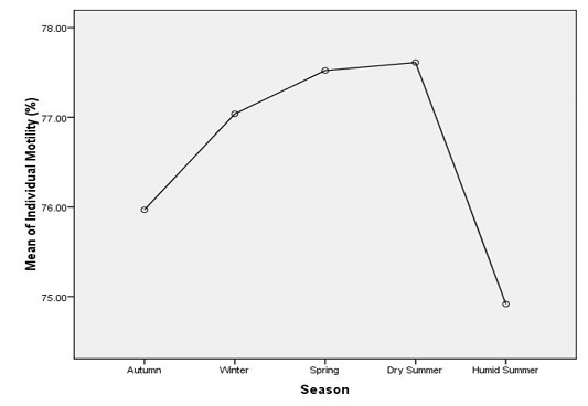 Overall variation in individual motility of Sahiwal bulls semen in different seasons of the year.