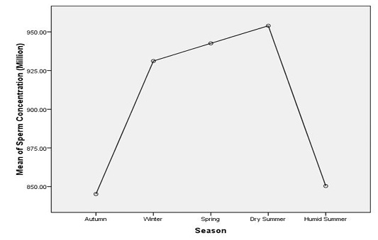 Overall variation in sperm concentration of Sahiwal bulls semen in different seasons of the year.