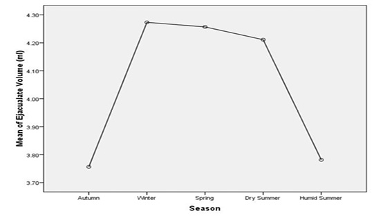 Overall variations in ejaculate volume of Sahiwal bulls semen in different seasons of the year.