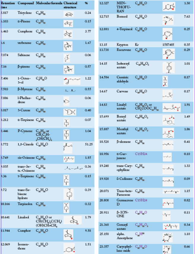 Identified compounds of Eucalyptus essential oil by HS-SPME (GC-MS).