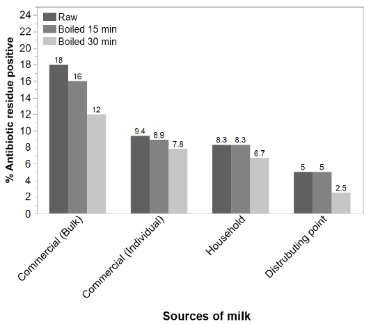 Effect of heat on prevalence of AR in milk of different sources. The sources of samples are indicated in the X-axis whereas the antibiotic residue % of samples are presented in the Y-axis. The color intensity of the bars indicates the state of the samples as (darker bar = raw milk samples, paler = 15 min boiled, pale = 30 min boiled samples).