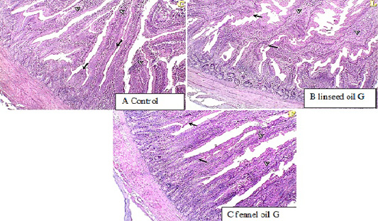 histopathological examination of duodenum showed normal intestinal villi with an increase in goblet cell count in linseed oil group (G2) and fennel oil group (G3).
