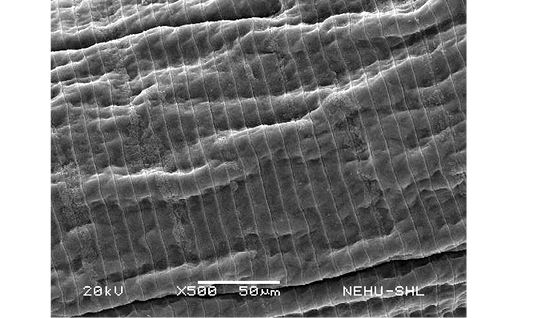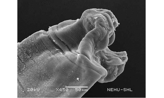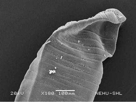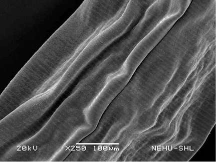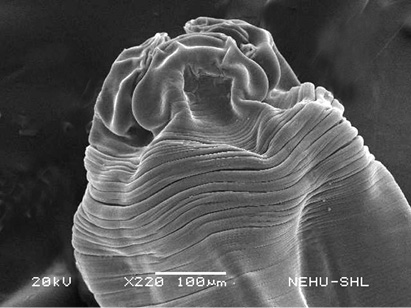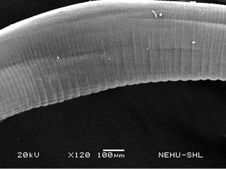 Scanning electron microscopy of the main body of an untreated (normal) A. galli. The cylindrical body consists of a series of transverse lines called annulations.