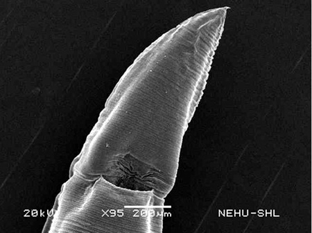Scanning electron microscopy of the tail end of A. galli treated with PZQ/PTP. The tail is deflated. A small terminal spine is seen at the tip.