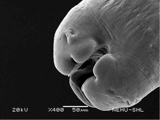 Scanning electron microscopy of the anterior part of an untreated (normal) A. galli. Three lips are seen at the bottom. The central hollow area is the mouth. On two lips are small eye-like papillae.
