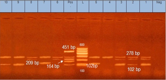 Multiplex PCR for S. aureus enterotoxin genes. Lane (L): 100 bp ladder DNA marker, Lane (Pos): control positive containing DNA of 4 S. aureus strains harboured Seb (164 bp), Sea (102 bp), See (209 bp), Sed (278 bp) and Sec (451 bp) genes. Lane (Neg): control negative. Lanes (1, 2, 3, 4, 5, 6, 7, 8, 9 and 10): isolates positive for Sed gene (278bp). Lanes (1, 2, 3, 5, 7, 9 and 10): isolates positive for Sea gene (102bp). Lanes (1,2, 3, 6and 8): isolates positive for See gene (209bp).