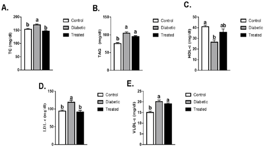 Means ± SEM of lipid profile (TC, TAG, LDL-c, HDL-c, VLDL-c). Values are mean ± SEM (8-10 rats/group. Means with different superscript are statistically different at p ≤ 0.05.