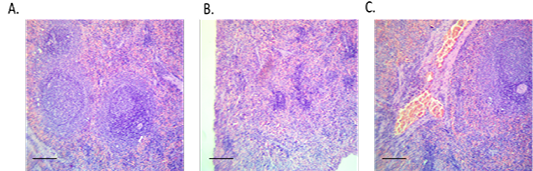 Spleen sections from control, diabetic or treated group. (A) Spleen of control rat showing normal histological picture (red and white pulps), H and E, x10, (B) Spleen of diabetic rat showing lymphoid depletion (shrunken white pulps), H and E, x10 and (C) Spleen of treated rat with the conjugate showing moderate vascular congestion, H and E, x10.