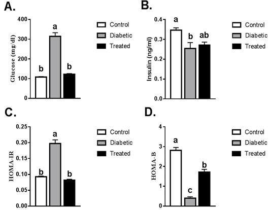 Serum levels of fasting blood glucose, insulin, HOMA-IR and HOMA-β. Values are mean ± SEM (8-10 rats/group). Means with different superscript were statistically different at p ≤ 0.05.