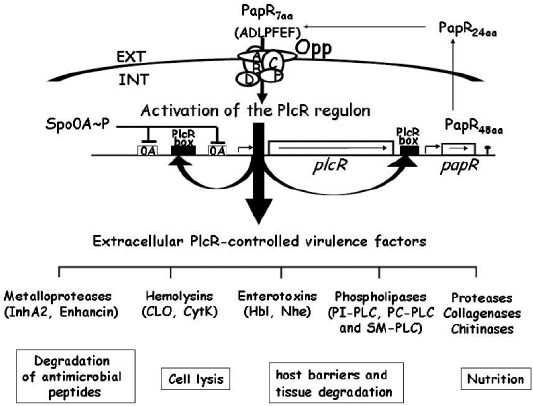 Diagrammatic representation of the transcriptional regulator PlcR and its cognate cell-cell signaling, peptide PapR (Gominet et al., 2001; Bouillaut et al., 2005; Gohar et al., 2008).