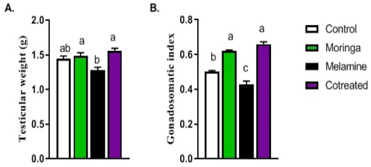 Effect of orally administered melamine and /or Moringa oleifera leaves extract (M/MOLE) on testicular weight and gonadosomatic index (a-b). Values are expressed as mean ± SEM of 8-10 rat/group. Means with different superscripts are significantly different at P < 0.05.