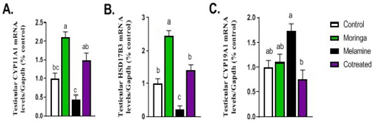 Effect of orally administered melamine and /or Moringa oleifera leaves extract (M/MOLE) on testicular mRNA expression of some steroidogenesis enzymes (A-C). Values are expressed as mean ± SEM of 8-10 rat/group. Means with different superscripts are significantly different at P < 0.05.