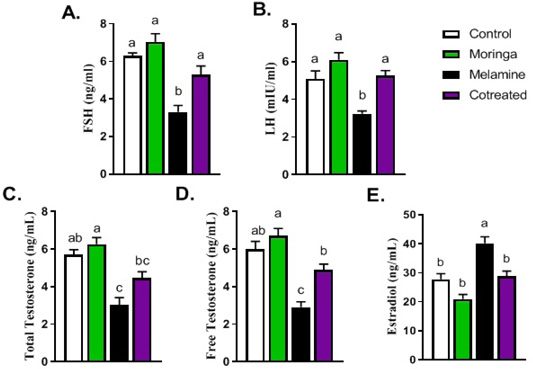 Effect of orally administered melamine and /or Moringa oleifera leaves extract (M/MOLE) on serum levels of gonadotropins and sex steroids (A-E). Values are expressed as mean ± SEM of 8-10 rat/group. Means with different superscripts are significantly different at P < 0.05.