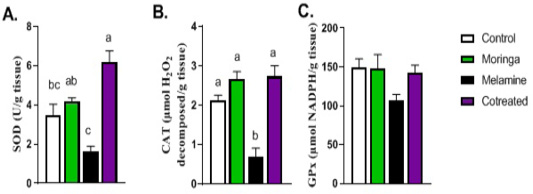 Effect of orally administered melamine and /or Moringa oleifera leaves extract (M/MOLE) on testicular antioxidant defense. Values are expressed as mean ± SEM of 8-10 rat/group. Means with different superscripts are significantly different at P < 0.05.